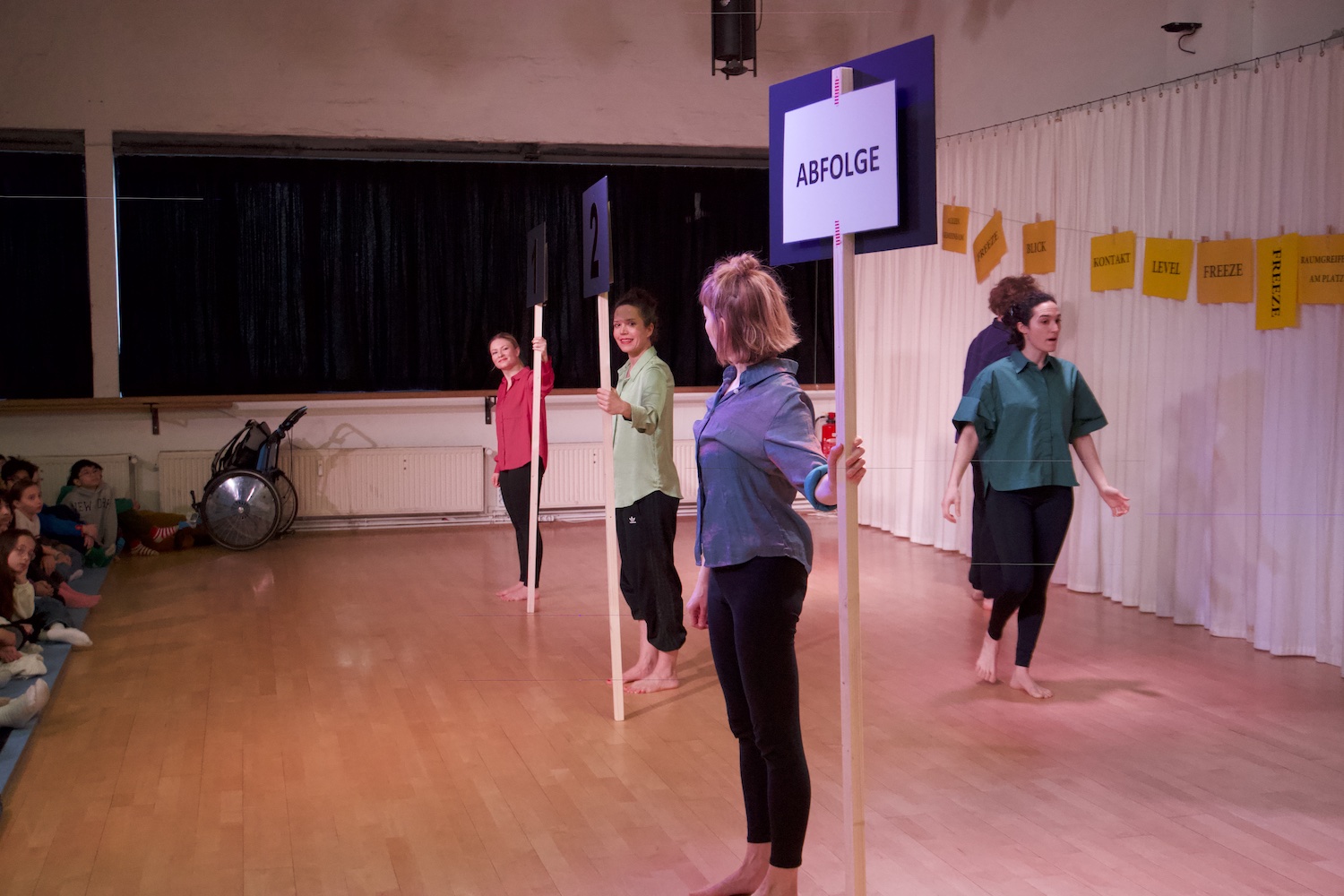 Mit großer Neugier und Begeisterung setzten sich die Schüler*innen mit den Choreograf*innen von »Step by Step« auseinander und gestalteten die getanzte Lecture Performance aktiv mit. Sie erforschten, wie alltägliche Bewegungen wie das Kämmen der Haare oder das Aufsteigen aufs Fahrrad durch unterschiedliche Bewegungsqualitäten verändert und kreativ neu interpretiert werden können.