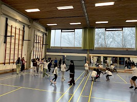 Ein tolles und aufregendes Format sind unsere Tandems! Die IV Klasse des Heisenberg-Gymnasiums besuchte den Wahlpflicht-Kurs Jg. 7 der Stadtteilschule Wilhelmsburg. Die Schüler*innen beider »Step by Step« Klassen tanzten, choreographierten und präsentierten gemeinsam ihre Bewegungsergebnisse. Sich kennen zu lernen und zu spüren, dass auch andere Schüler*innen zeitgenössisch tanzen, wirkt sich motivierend auf den laufenden Probenprozess aus.