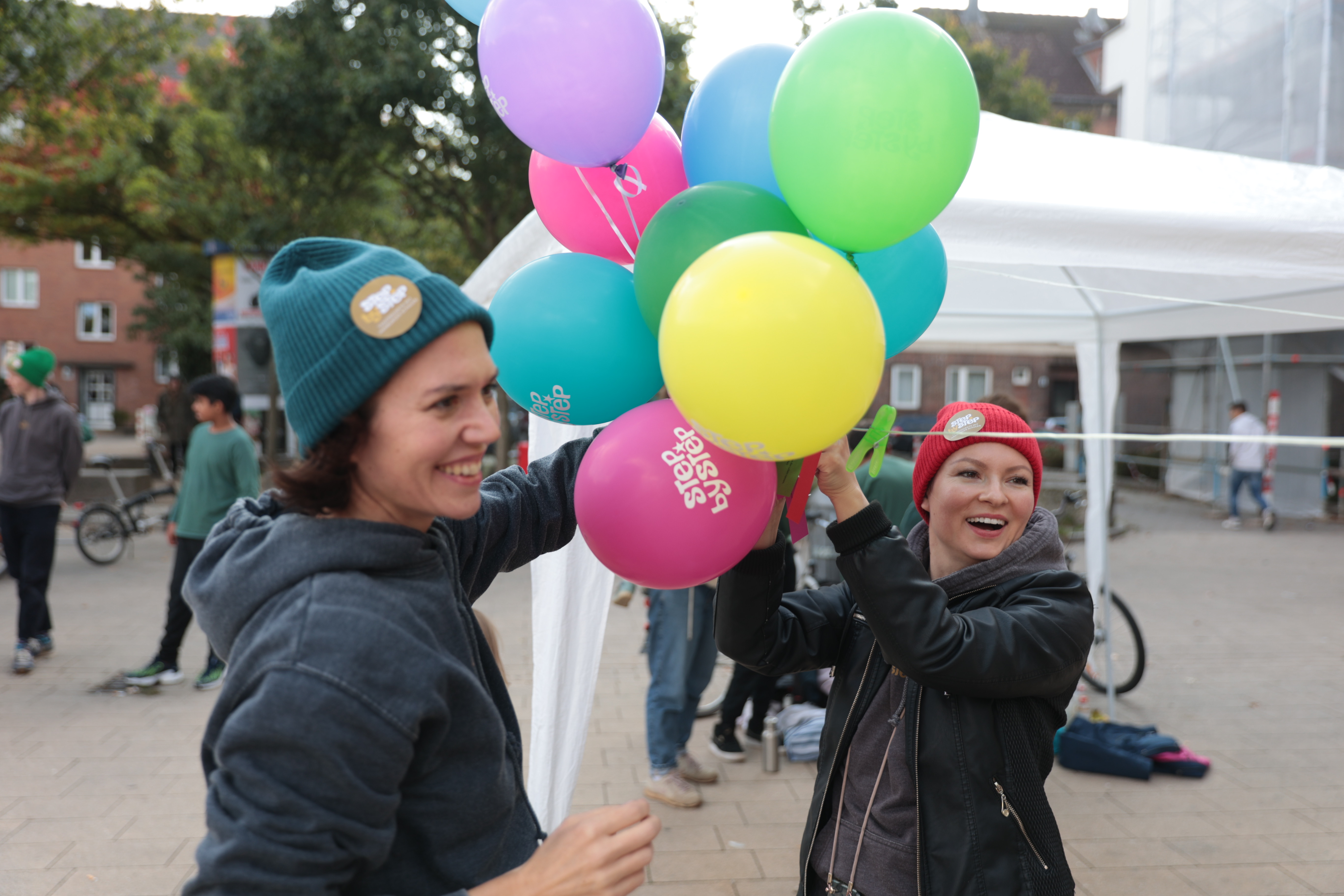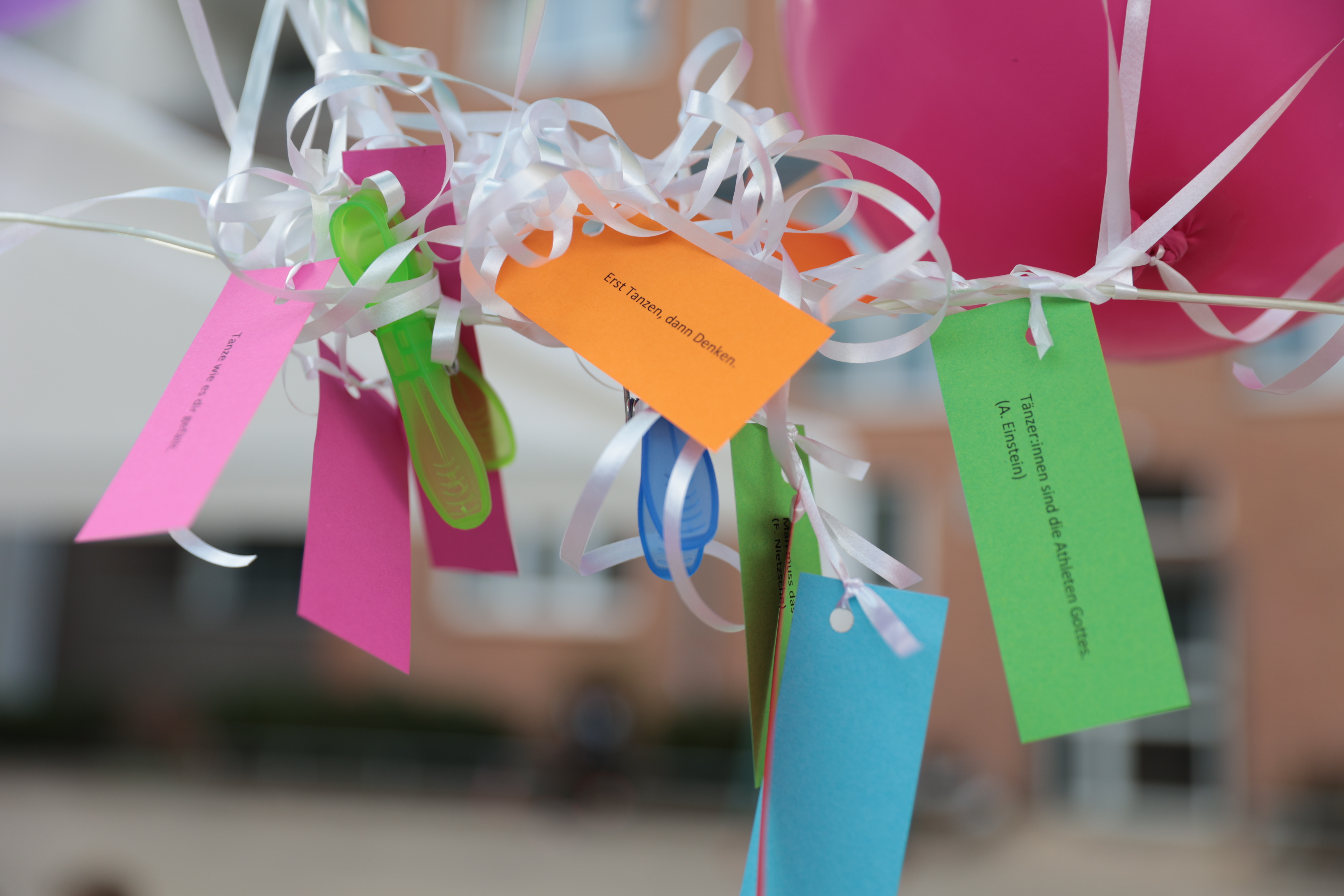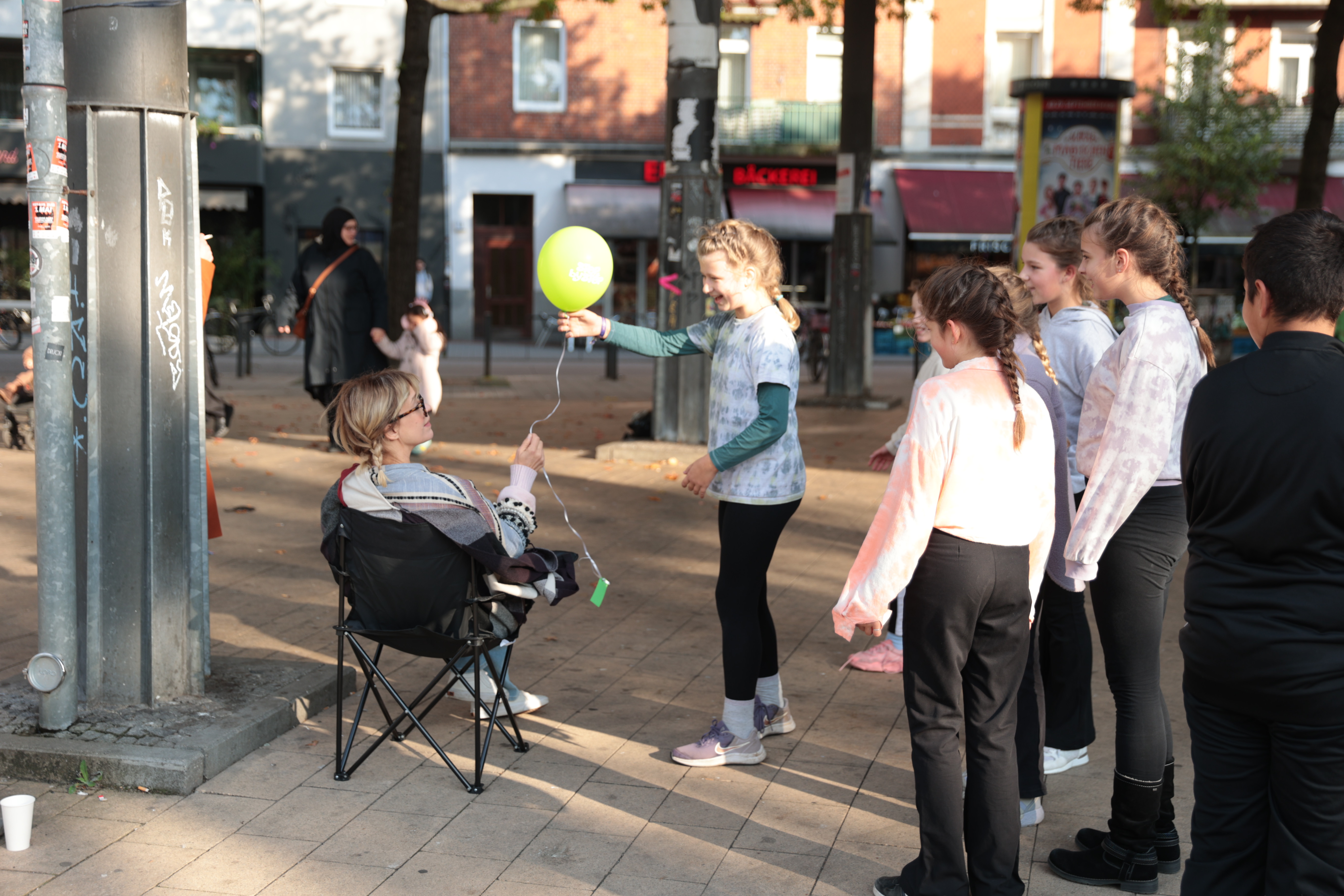 Danach waren auch die Zuschauer*innen gefragt mitzumachen. Die LABOR#4 Outdoor Kinder und Jugendlichen zogen in einer Gruppe los, um alle, die sich auf dem Stübenplatz tummelten zum mittanzen und sich begegnen zu motivieren. Als Impulsgeber wurden kleine "Loszettel" an die Zuschauer*innen und Passant*innen und Luftballons mit tanzrelevanten Sätzen verteilt.