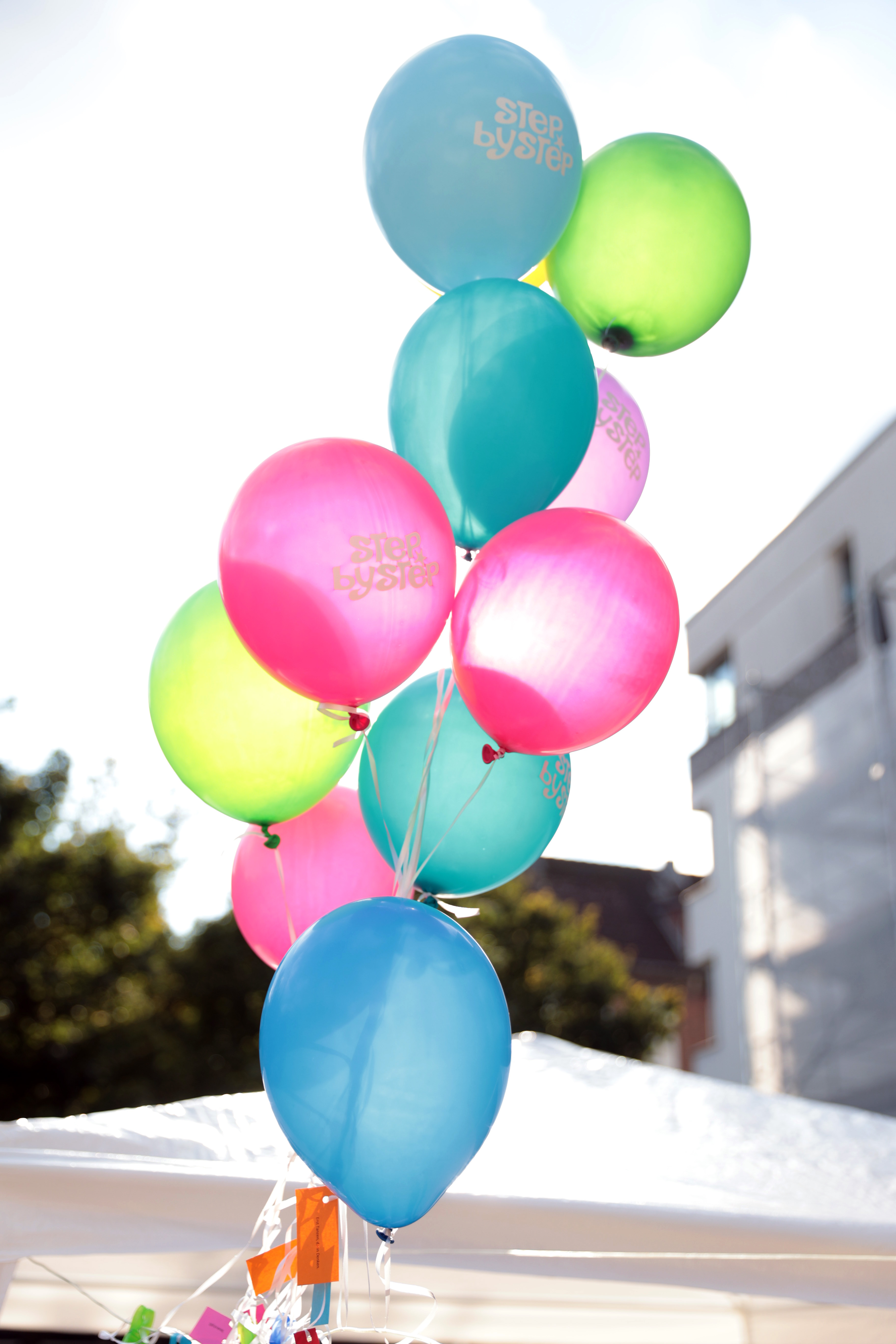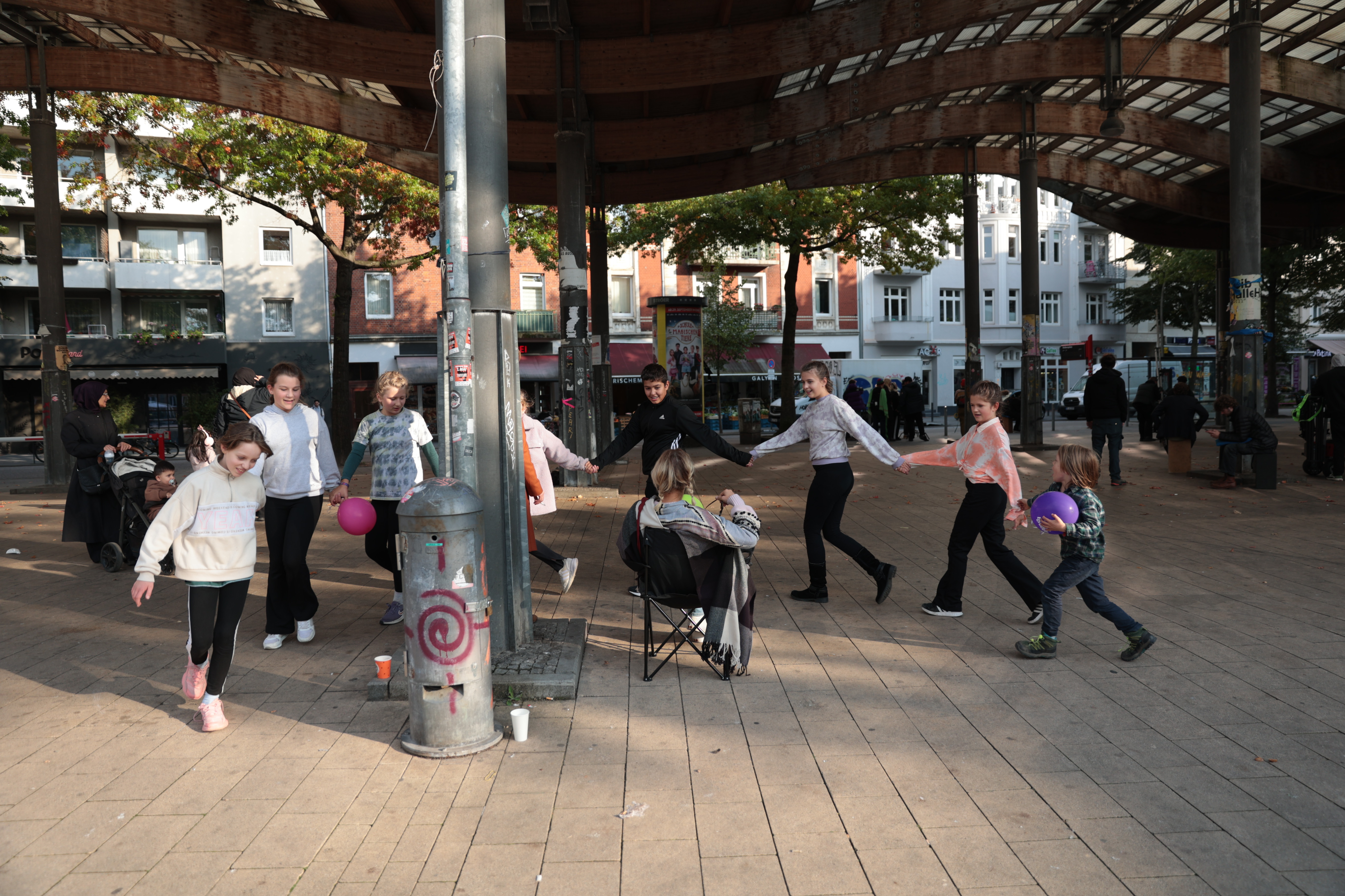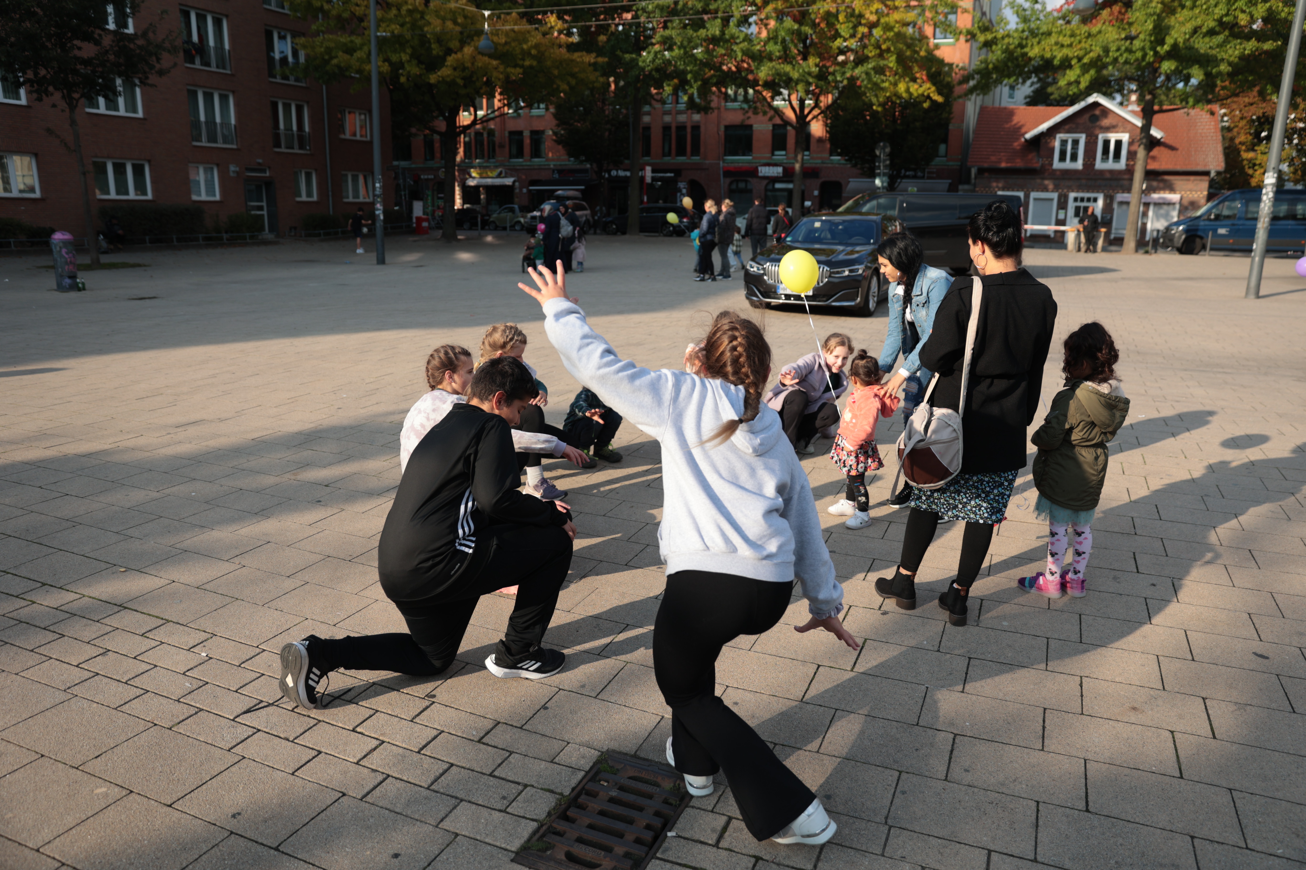 Danach waren auch die Zuschauer*innen gefragt mitzumachen. Die LABOR#4 Outdoor Kinder und Jugendlichen zogen in einer Gruppe los, um alle, die sich auf dem Stübenplatz tummelten zum mittanzen und sich begegnen zu motivieren. Als Impulsgeber wurden kleine "Loszettel" an die Zuschauer*innen und Passant*innen und Luftballons mit tanzrelevanten Sätzen verteilt.