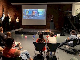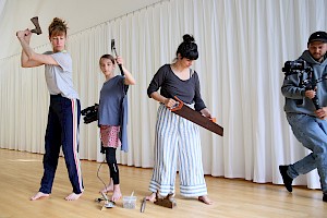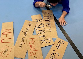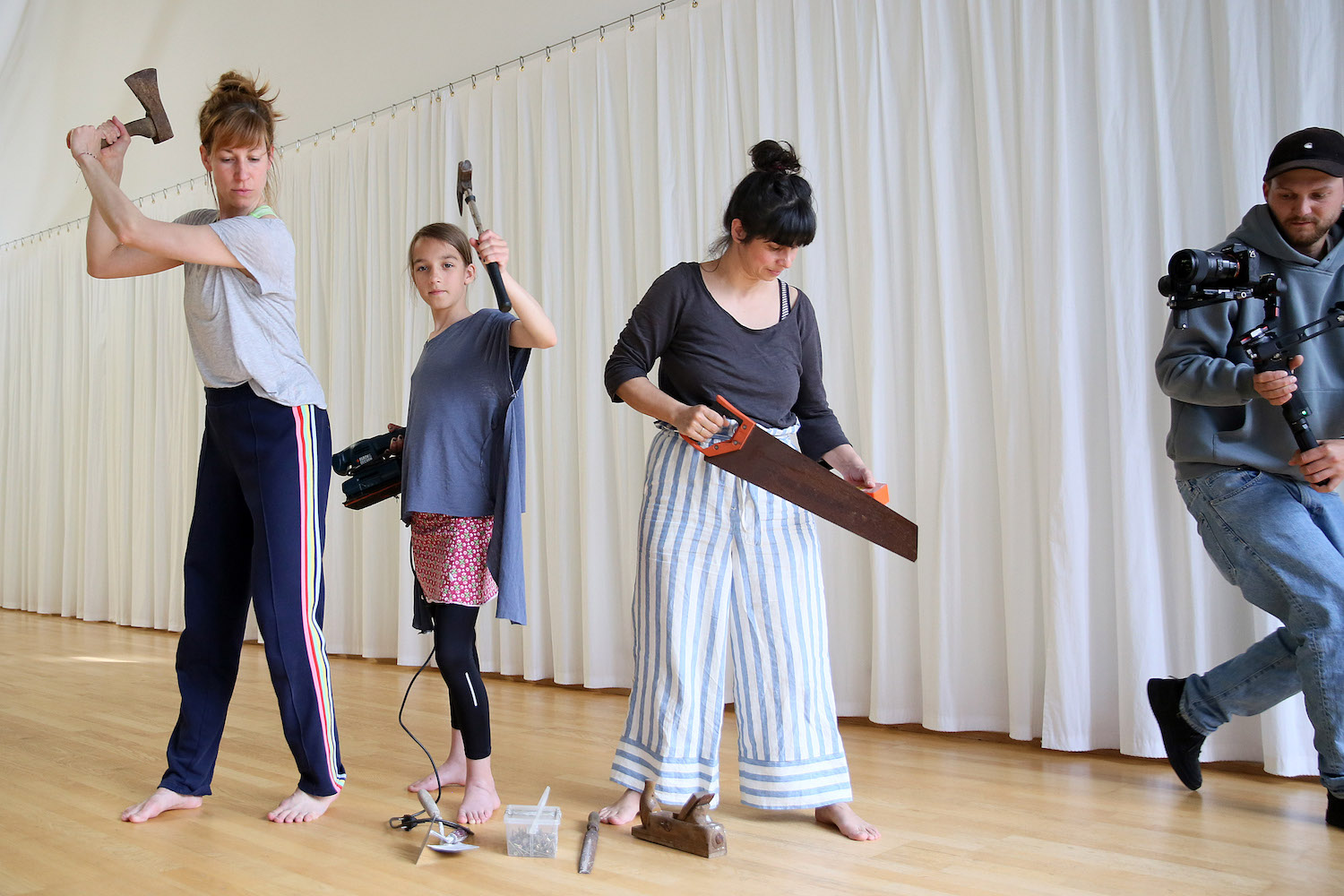 Komplettiert wurde das Team vom Videokünstler Felix Althaus. Er dokumentierte nicht nur den Prozess, sondern eröffnete den Teilnehmer*innen mit seinen filmischen Ideen und Sichtweisen auf Raum und Bewegung neue Möglichkeiten wie z.B. den Einsatz eines Green Screens.