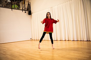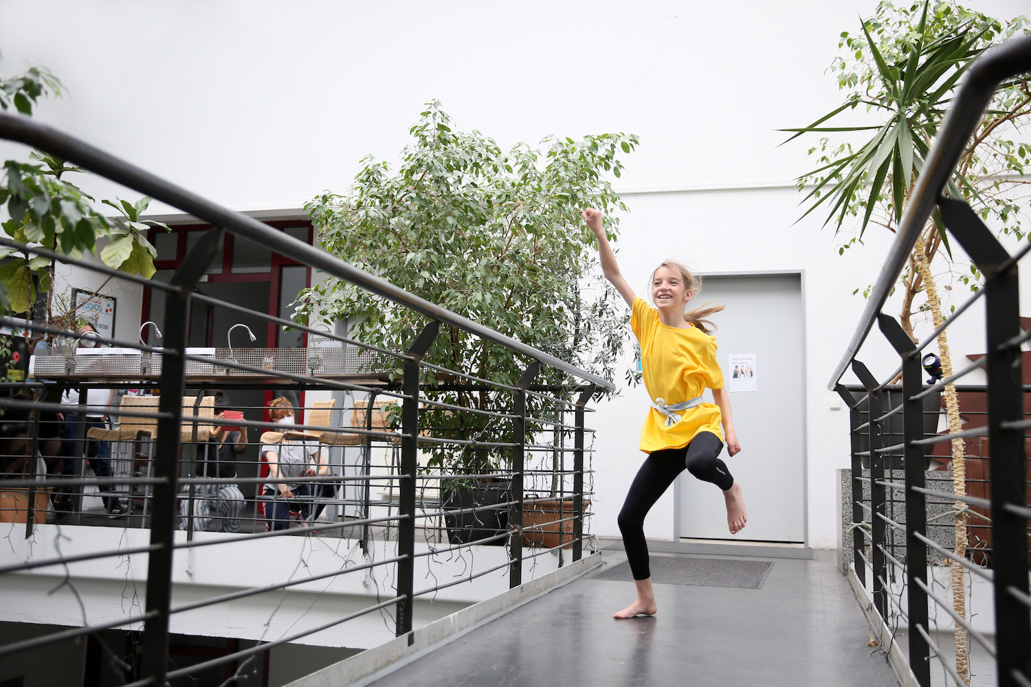 In der Präsenzzeit kamen die Teilnehmer*innen mit ihren Choreografinnen unter Einhaltung der vorgeschriebenen Distanz- und Hygienevorschriften zusammen. Hier konnten sie sich gemeinsam in einem Raum bewegen, ihre digital entstandenen Ideen zusammentragen und Bewegungssequenzen weiterentwickeln. Nach den privaten Räumen fokussierten sie sich tänzerisch auf öffentliche Räume: Treppenhäuser, Flure, Tanzsäle und Schulgelände. Ob mit schwerem Werkzeug oder leichten Luftballons, den kreativen Ideen, um den Raum mit Bewegung zu gestalten, waren keine Grenzen gesetzt. Die Fotografin Anja Beutler begleitete hier fotografisch.