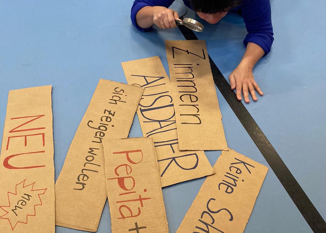 Entsprechend der Corona-Beschränkungen starteten die LABOR-Treffen ab Januar über verschiedene Videokonferenz-Plattformen. Zunächst ging es darum, dass digitale Medium auszuloten und Wege zu finden, kreativ mit ihm umzugehen. Es entstanden z.B. Mosaike aus Händen und Füßen, die vor der Kamera gezeigt und zueinander in Beziehung gesetzt wurden. Den eigenen Körper wahrnehmen und präsentieren, Gesten zu verschiedenen Qualitäten finden und sie in eine Abfolge bringen. Nach dem Ausloten des Mediums lösten sich die Teilnehmer*innen von der Kamera, vom digitalen Raum, um sich in den realen Raum zu begeben.