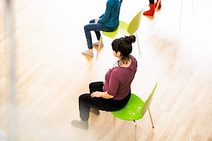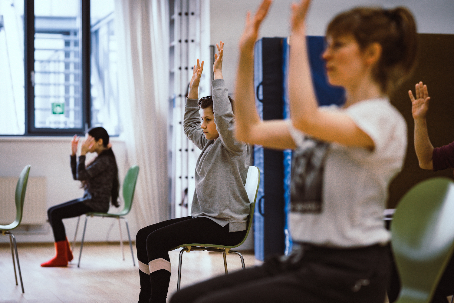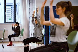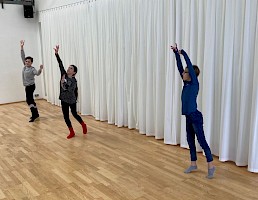 Sie arbeiteten assoziativ zu den von ihnen gewählten Gesten und erprobten Bewegungsabläufe an verschiedenen Orten in ihren Wohnungen - sitzend, stehend, liegend und in verschiedenen Tempi und choreografierten einen Stuhl- und verschiedene Teppichtänze.