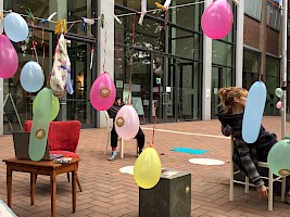 Am 17. September präsentierte sich LABOR#3 während des Kulturfestivals altonale in Altona mit einer installativen Performance. Neben einer freistehenden Installation, die die Passanten dazu einlud, den Film zu schauen, gab es einen Teppich-Tanzparkour mit verschiedenen Bewegungsqualitäten. Hier konnte jede/r einsteigen, die/der Lust hatte sich auszuprobieren und in Zeitlupe, hoch oder tief, eng oder weit zu bewegen oder auf dem crazy carpet völlig verrückt zu sein. Zettel, die an einer Wäscheleine und an Luftballons hingen, animierten darüber hinaus u.a. zu „tanze mit mir“, „lass mich schweben“, „trau dich“ oder „erst tanzen dann denken“. Von den Teilnehmer*innen wurde zwischendurch der Stuhltanz präsentiert.